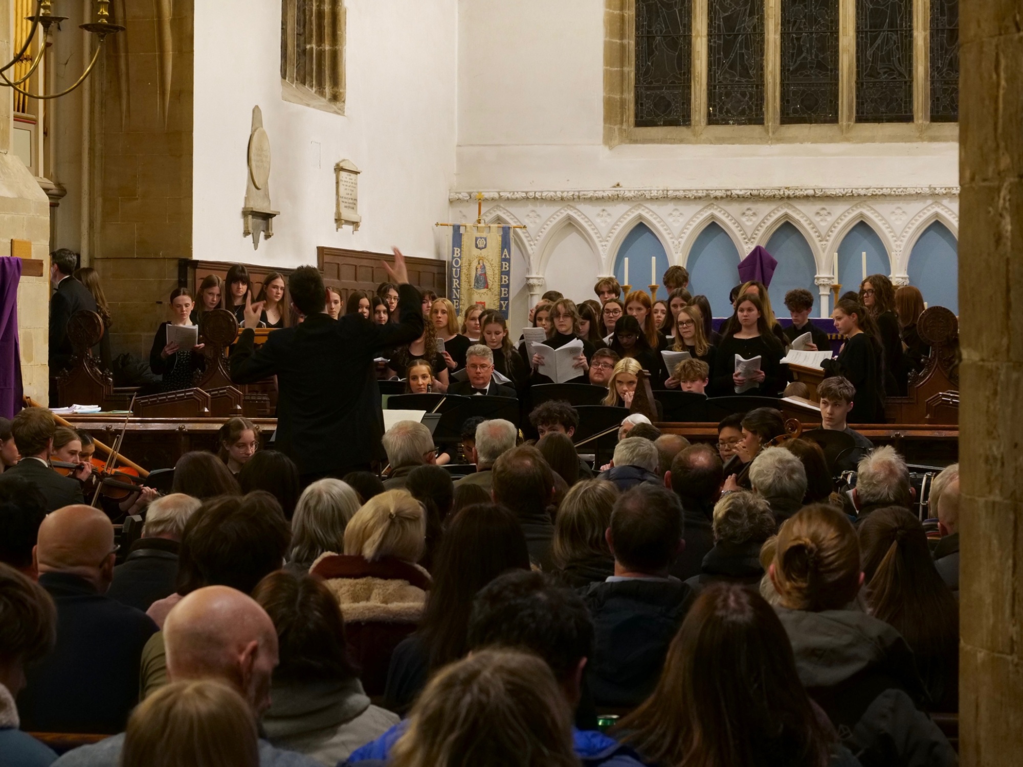 The combined Junior and Senior Chamber Choirs then presented Franz Biebl’s Ave Maria with remarkable purity of tone, filling the Abbey with a sense of stillness and reverence. Written for four-part upper voices with an additional trio of soloists, the unaccompanied seven-part textures present a considerable challenge; however, the performance was delivered with apparent ease. The trio—Sophie Robinson, Alix Smith, and Anya Copestake—each contributed individual solo passages between the choral sections. Their voices, heard in the silence of the Abbey, created a profoundly moving and reflective atmosphere.